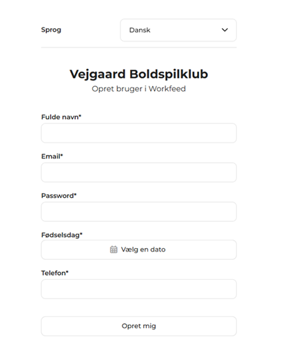Allerførst skal du oprette en VB-bruger i Workfeed. Det gør du ved at klikke dig ind på dette særlige VB-link, hvor du bliver mødt af følgende formular: